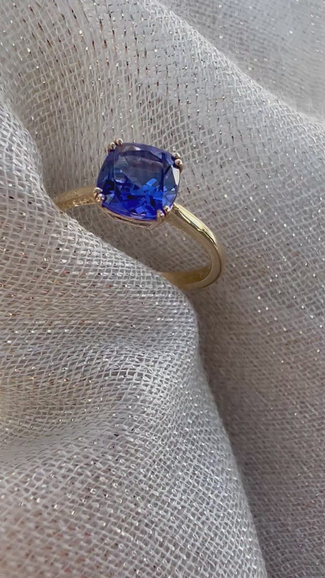 1,42ct cushion cut Tanzanite ring set in 18ct yellow gold.