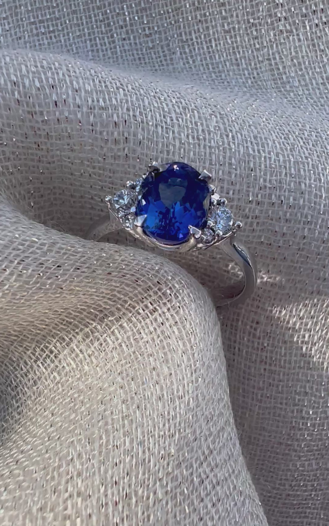 Oval Tanzanite with cluster of side diamonds.