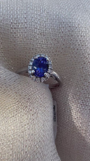 1,16ct of oval Tanzanite with Halo of diamonds set in 18ct white gold.